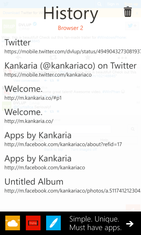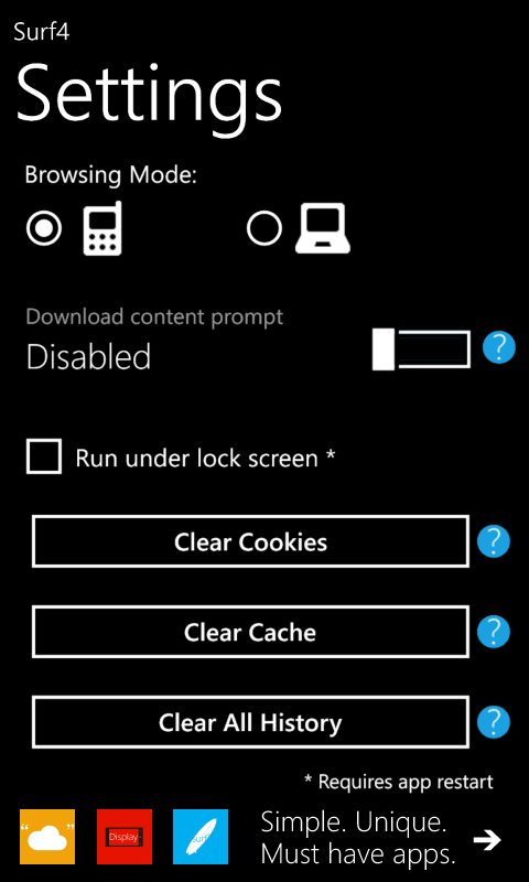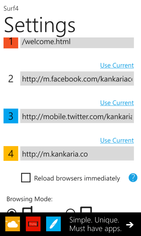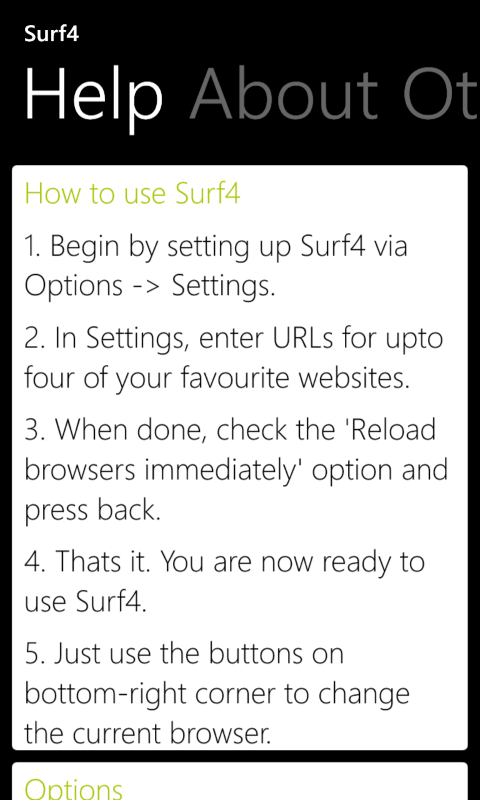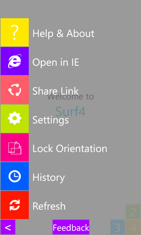 Surf4 (or 'Surfer') browser is a different take on the Windows Phone browsing experience with a clutter free full screen layout.Surf4 is not like common browsers. It is aimed at giving you the simplicity to visit up to 4 of your frequently used websites with just one tap!