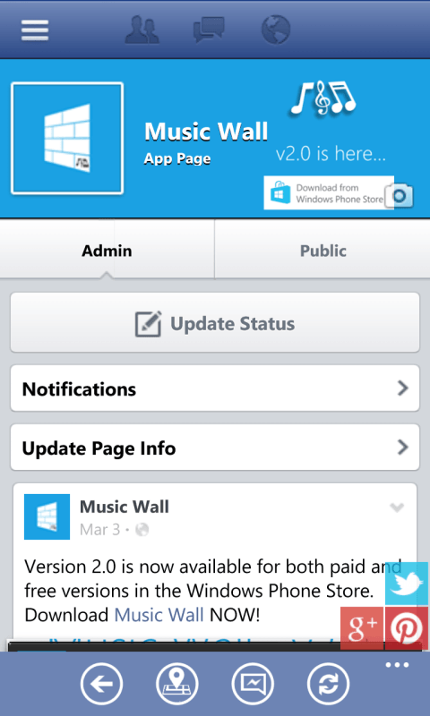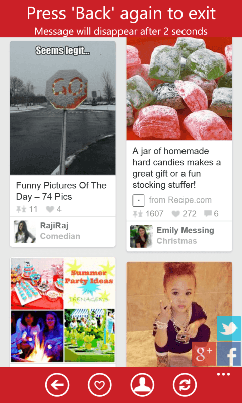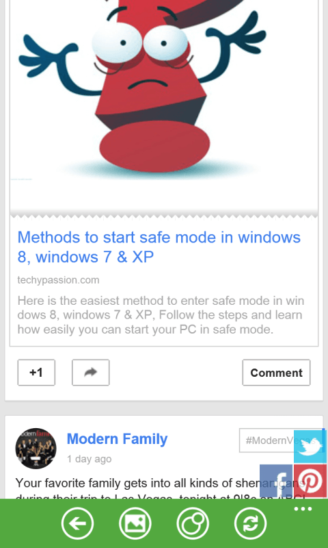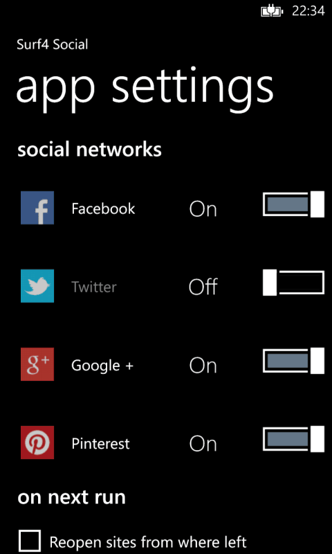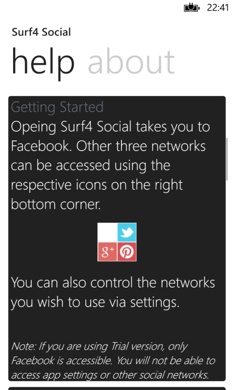 Surf4 Social is a step forward from the successfully running browser Surf4, which again provides a unique way of browsing four of the most used social networking sites - Facebook, Twitter, Google+ and Pinterest, all simultaneously.Every social network has its own set of frequently used options available via app bar, complete with the Modern UI.
